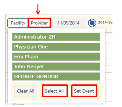 To view multiple providers in the same calendar you can click on the provider as shown below then select the providers or “Select all” option and click on “Set Event”.