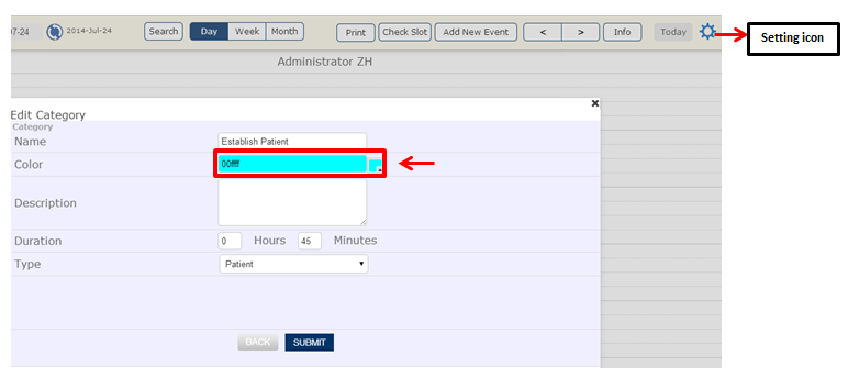 To change the color of the category, click on the “settings” icon, you will receive a pop up with the details of the modules. Select a category and right below you will have the color that you wish to edit. You can click on the edit button right beside the color to change the color for the relative category