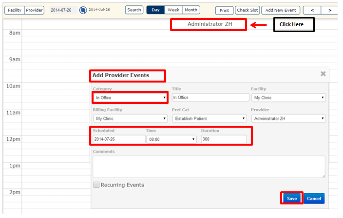 To select the in and out timing for the provider you can select the provider by clicking on the name, select the category as “In Office” or “out of office”, select the date, time also set the duration right beside the time and click on “Save”.