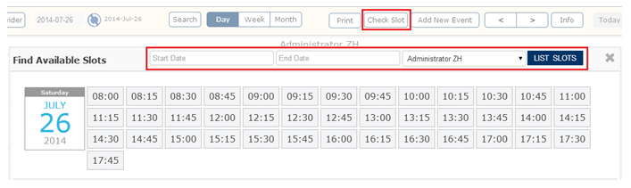 To check for the list of available slot you can click on the “Check Slot” button, add the start and end date with the facility and click on list slots button.